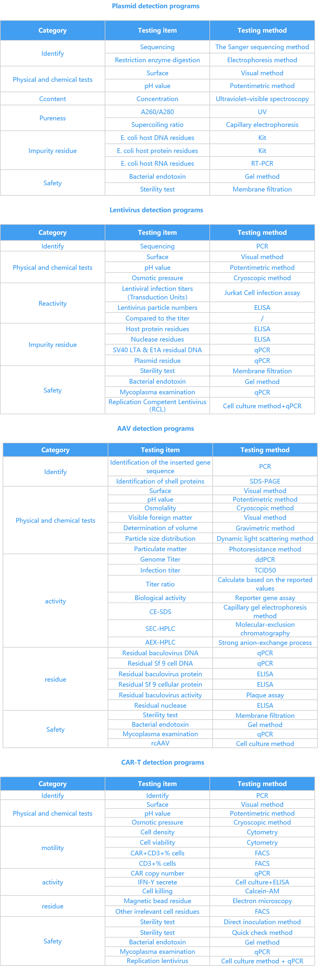 We can provide customers with method development and validation services, plasmid, virus, cell and other products release testing, raw material testing and laboratory environmental control services